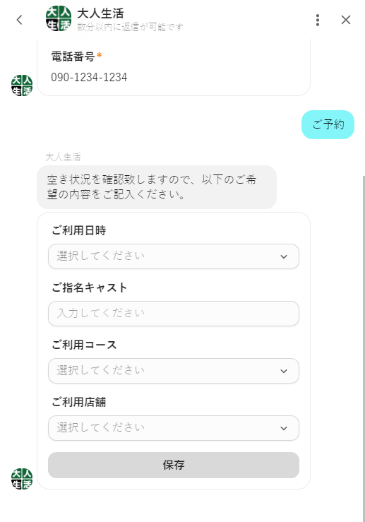 ご希望の情報を入力して保存をタップすると、すぐに空き状況を確認したのち、