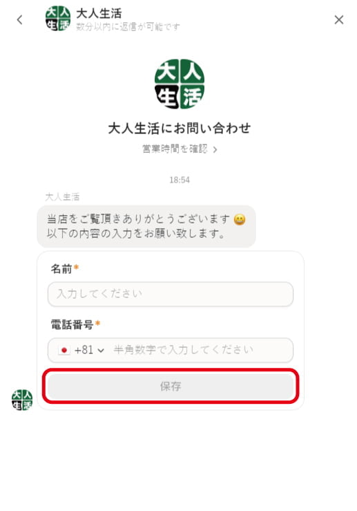お名前とお電話番号を入力していただきましたら、赤丸の『保存』をタップ。